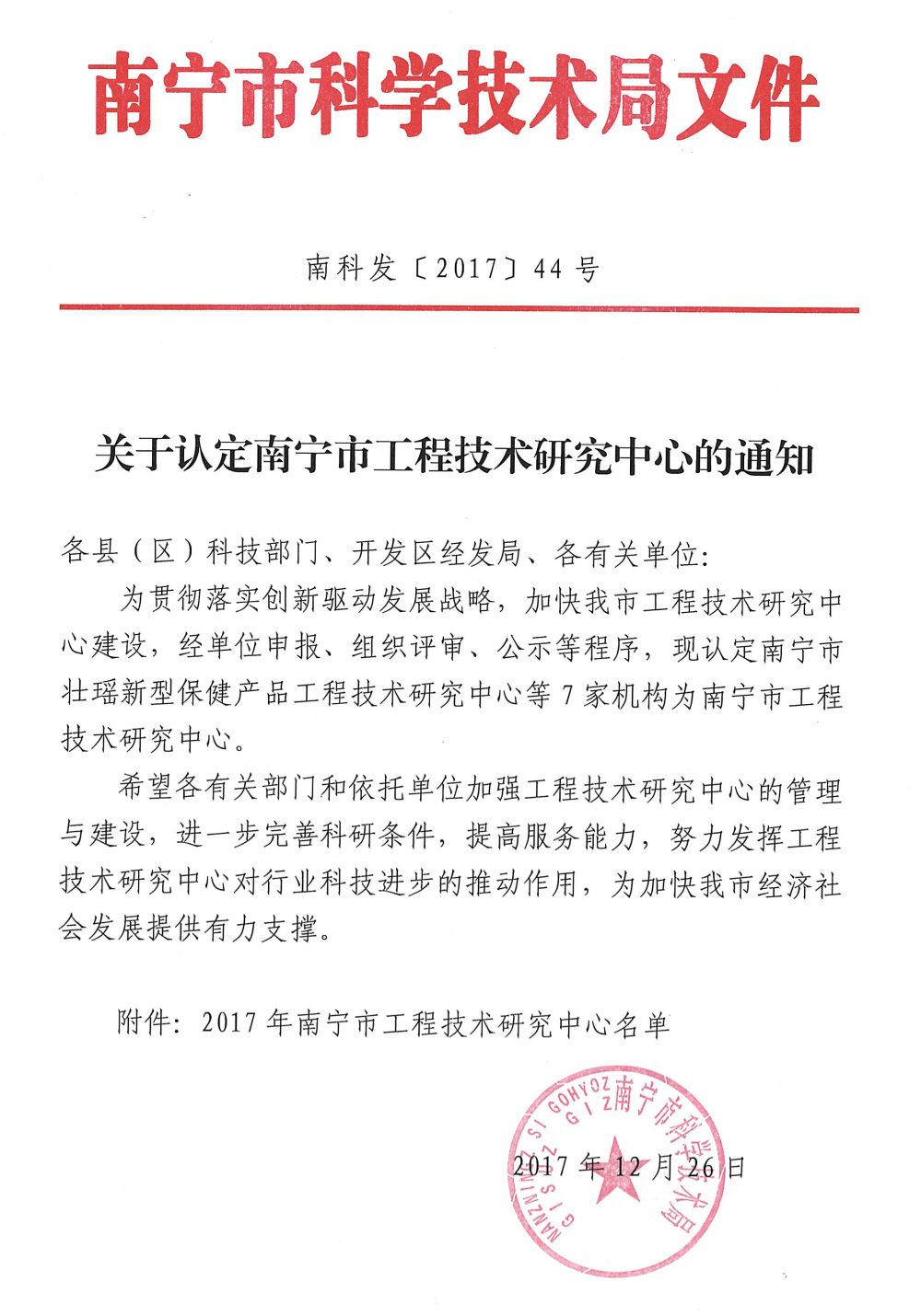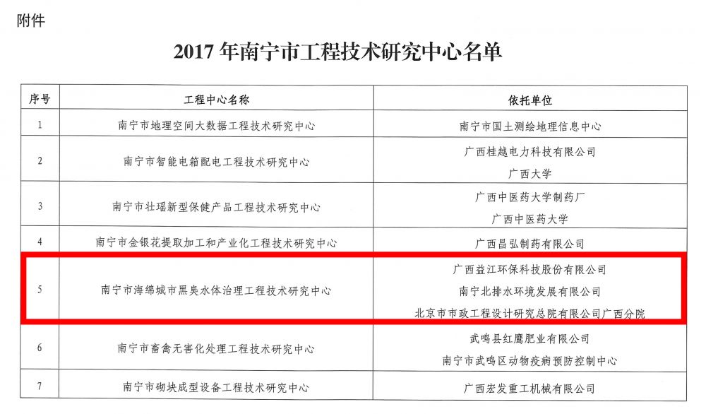 1月23日,益江环保“南宁市海绵城市黑臭水体工程技术研究中心”入选2017年南宁市工程技术研究中心名单(南宁市仅7家单位获认定)。