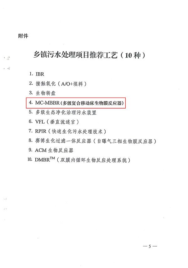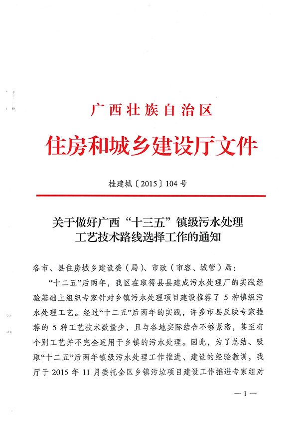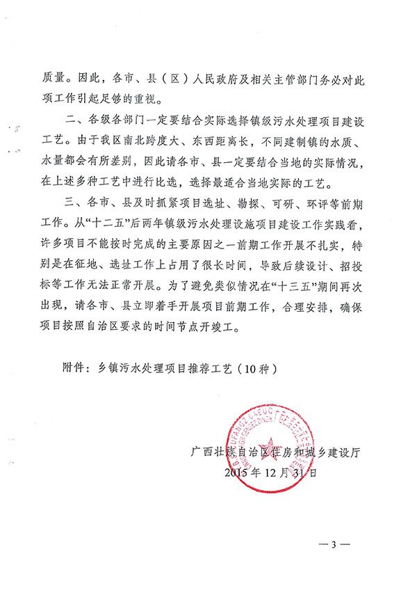 12月31日,广西住建厅印发了《关于做好广西“十三五”镇级污水处理工艺技术路线选择工作的通知》(桂建城【2015】104号),益江环保核心专利技术MC-MBBR工艺通过复审,成为广西“十三五”乡镇污水处理项目推荐工艺之一。
