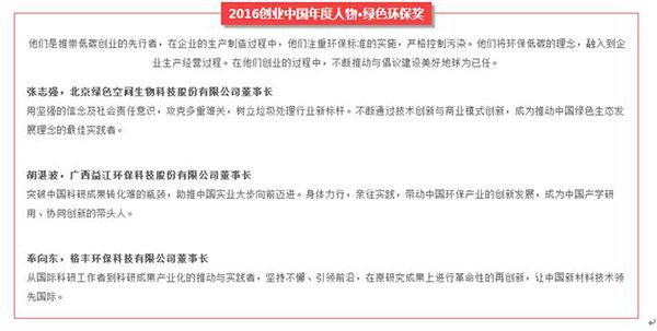 益江环保董事长胡湛波获2016年创业中国年度人物“绿色环保奖”