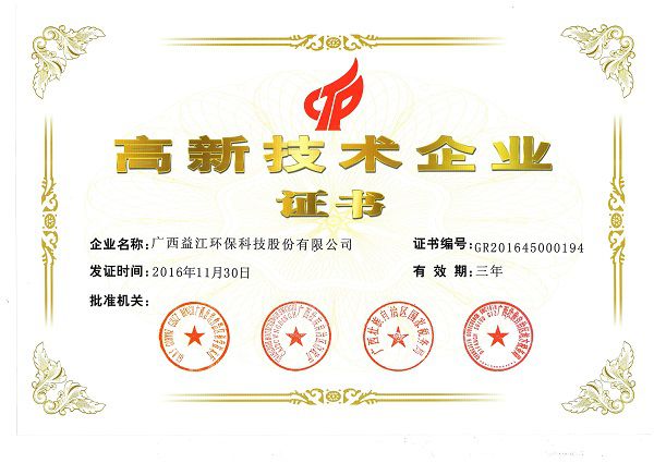 1月18日,益江环保获得广西壮族自治区科学技术厅、财政厅、国家税务局、地方税务局颁发的《高新技术企业证书》,继2013年获得首次认定后,再次获得高新技术企业认定。