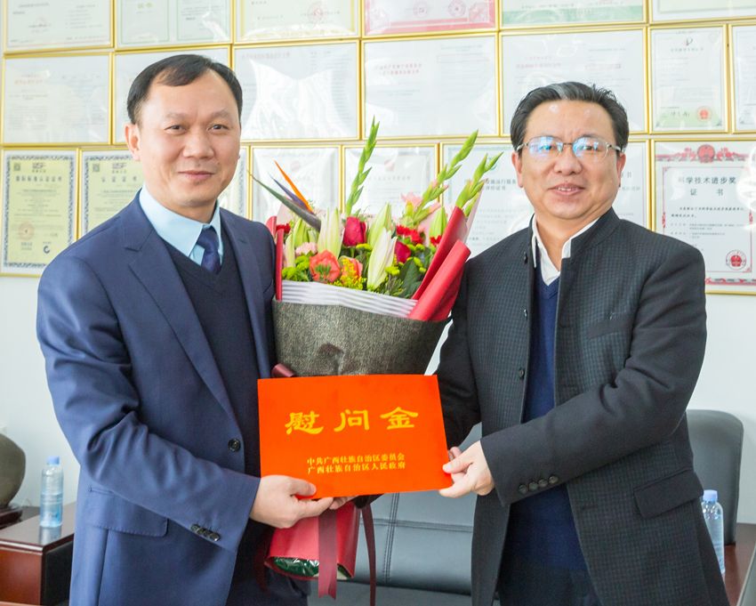 2月9日下午,自治区人大常委会副主任卢献匾在广西大学副校长、南宁市人大常委会副主任钱健的陪同下莅临广西大学科技园,代表自治区领导对国家“万人计划”科技创业领军人才、广西大学资源环境与材料学院教授、益江环保董事长胡湛波致以亲切的问候和新春祝福。